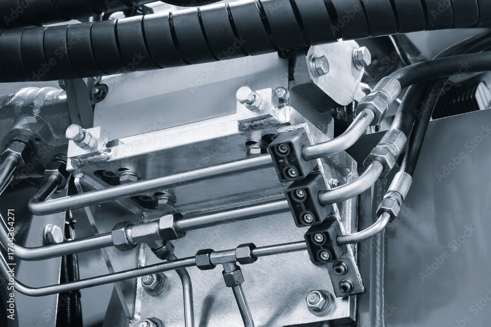 Hydraulic power drive hoses of high pressure machine, industrial power concept background. #1744364271