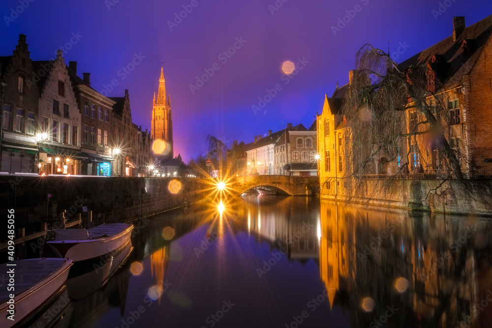 Iconic fairytale view of the canals of Bruges, during the rain. Nepomucenus Bridge and Church of Our Lady Bruges in the background. Belgium #409485056