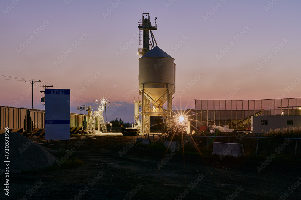 Illuminated grain silo and processing facility in Saskatchewan at night with industrial equipment and twilight sky. #1720372926