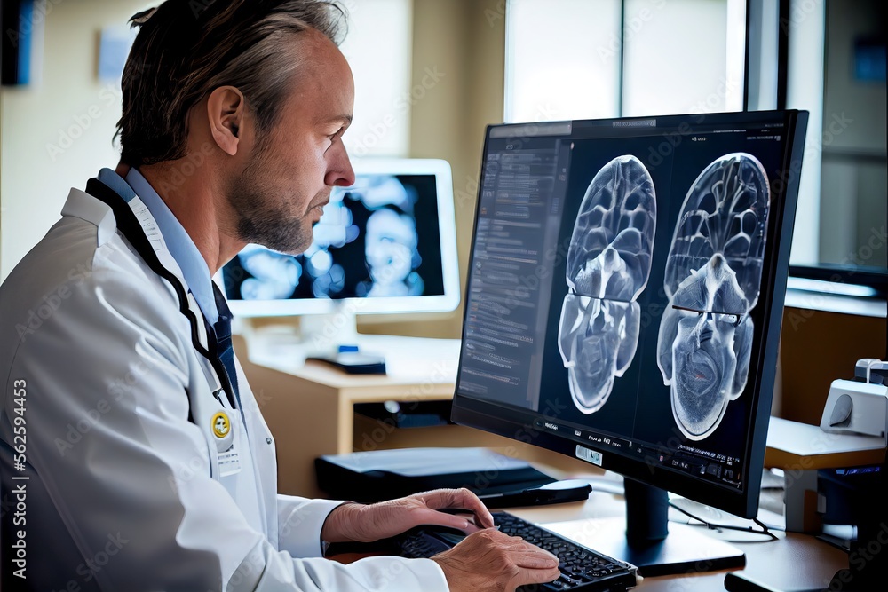 Illustration of a doctor looking at a ct scan on a computer screen generative ai #562594453