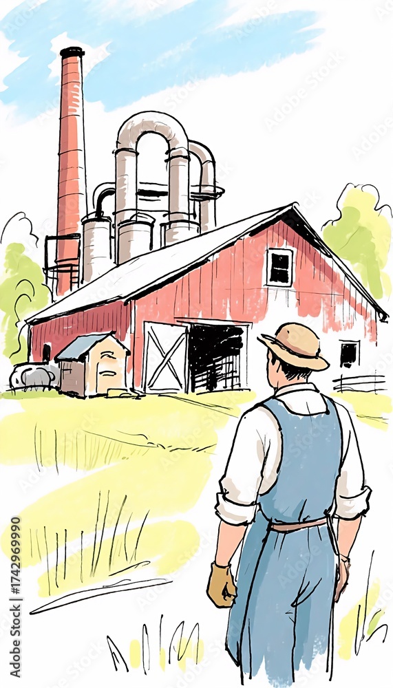 Illustration of a Man Looking at a Farmhouse and Industrial Chimney, Watercolor Style #1742969990