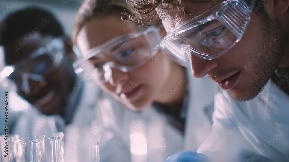 In a modern chemistry laboratory, several medical students concentrate on their intricate experiments while wearing white lab coats and safety goggles. The students demonstrate tea #1809545781