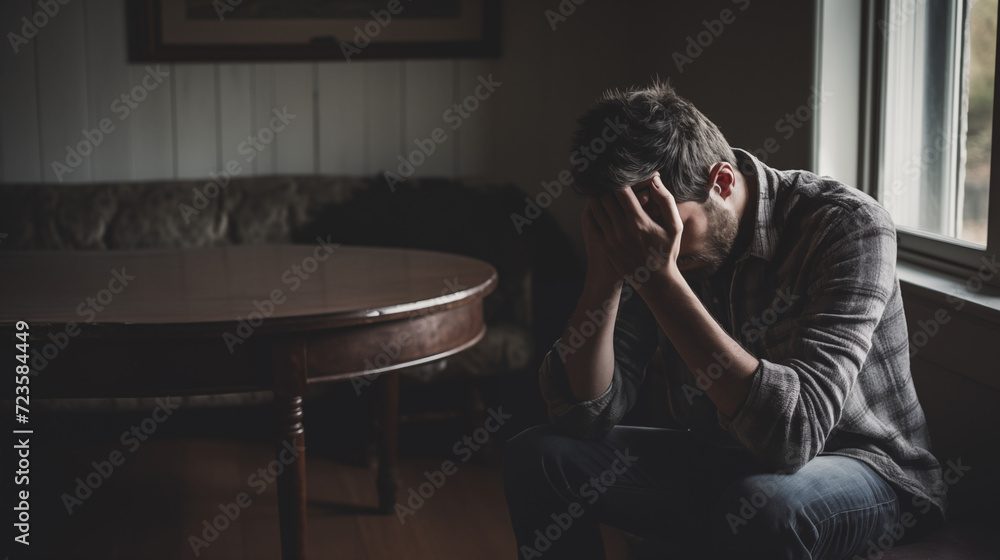 In the quiet solitude of his home, a lone man sits with a heavy heart, his hand pressed against his head in a gesture of sorrow and anguish #723584449