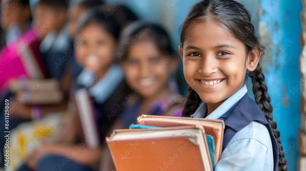 Indian young girl holding books in the school #861129809