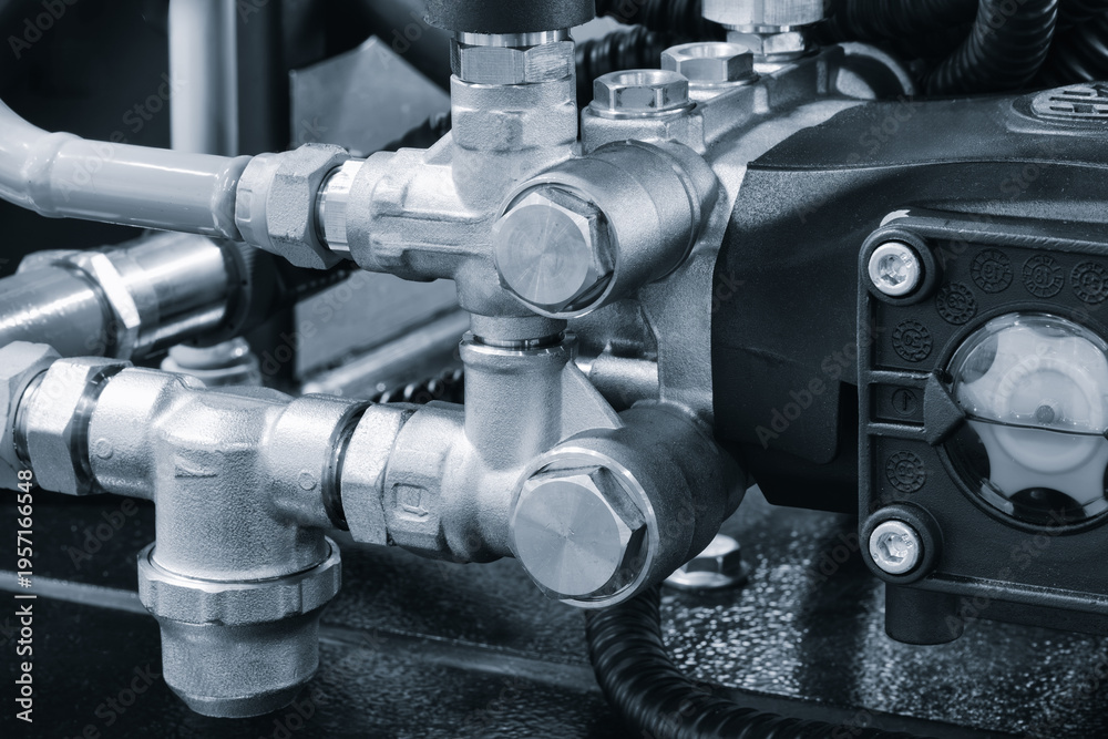 Industrial machine concept, industrial hydraulic machine with rubber and metal pipes high pressure pipes, real technical image. #1957166548