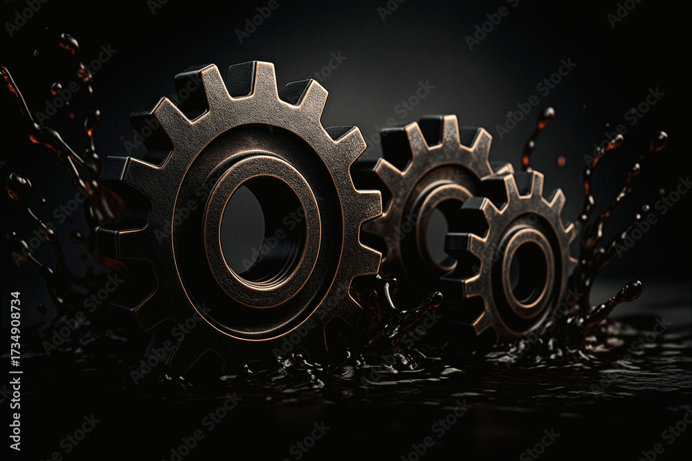 Industrial Metal Gears with Oil Splash on Dark Background – AI Generated #1734908734