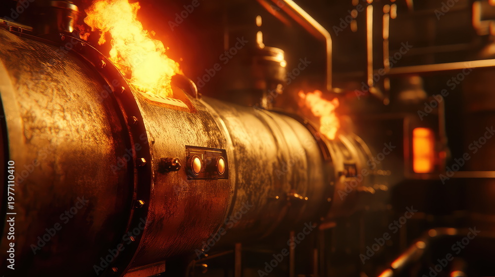 Industrial pipeline featuring intense flames escaping from its surface, creating a fiery atmosphere in a dark, grimy factory interior, suggesting a hazardous and powerful operation #1977110410