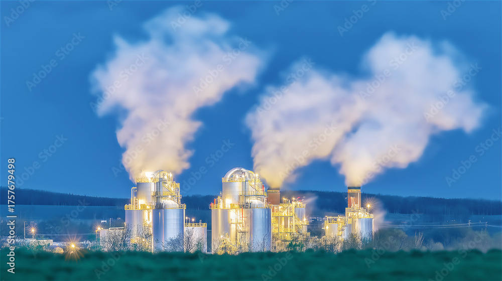 Industrial power plant emitting smoke at sunrise, concept of energy, pollution and environmental impact with copy space. #1757679498