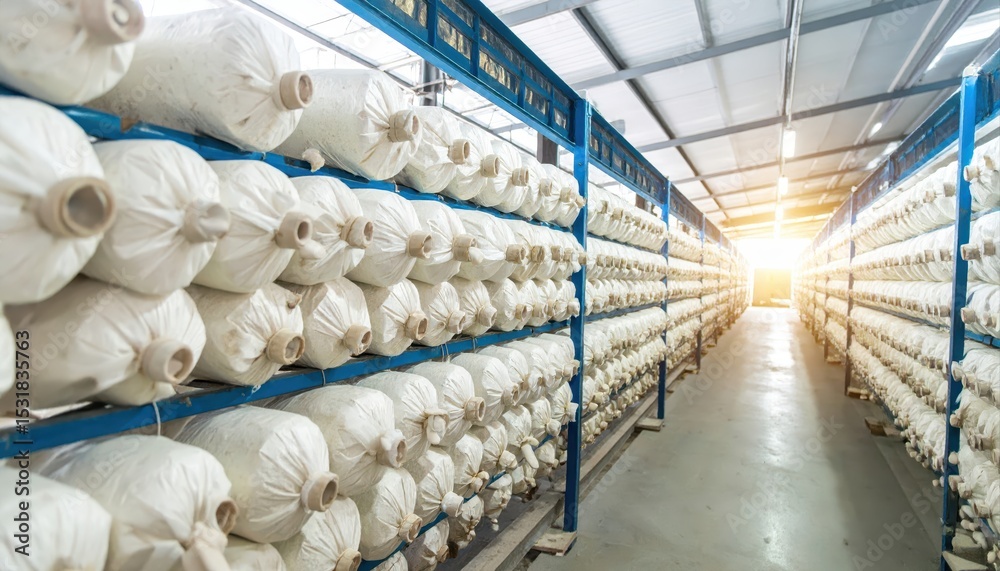 Industrial textile warehouse with organized rolls of fabric storage and industrial lighting #1531835763