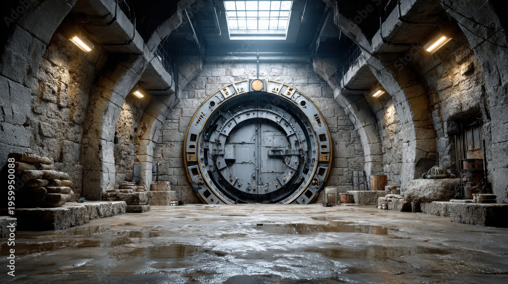 Industrial underground stone vault with huge metal door illuminated by ceiling lights in mysterious old warehouse chamber #1959950088