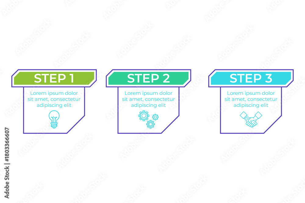Infographic clearly presenting three steps in process using distinct colors. Each step labeled and including brief descriptions, aiming for easy understanding #1803366607