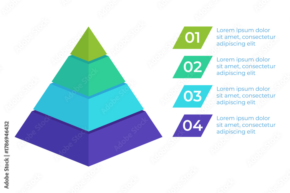 Infographic displaying four-layer pyramid structure. Each layer representing various categories or stages. Clear labels guiding viewer through information #1786946432