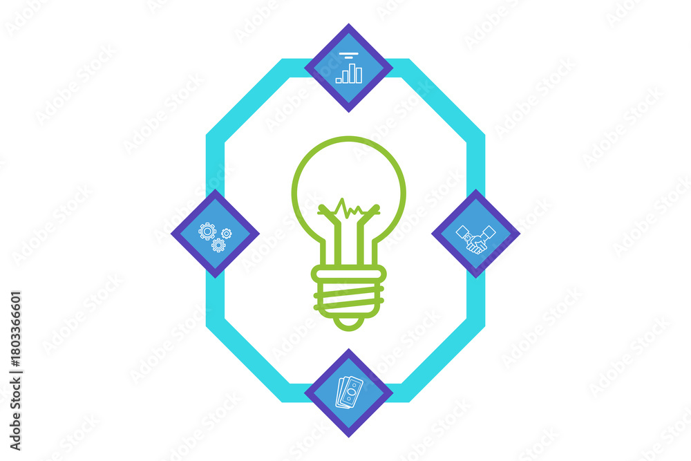 Infographic illustrating various stages of creative process in business. It showing how ideas transform into actionable strategies and successful outcomes #1803366601
