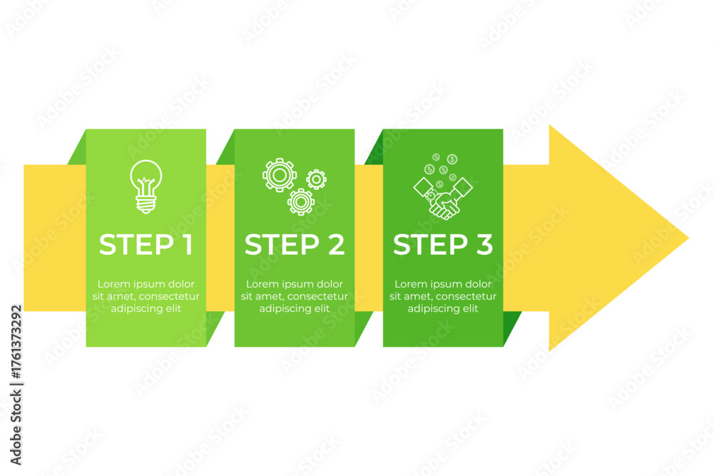 Infographic of three sequential steps in process. Each step marked and including icons representing ideas and actions #1761373292