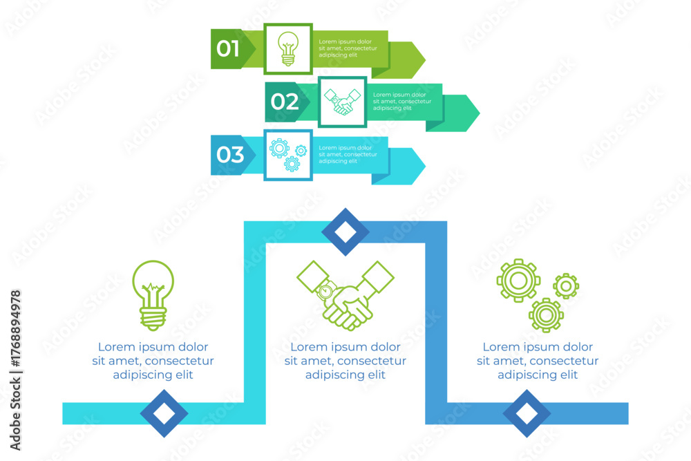 Infographic set visually presenting three process steps featuring icons of light bulbs, gears, and handshakes. Each step emphasizing distinct concepts and ideas in clear layout #1768894978