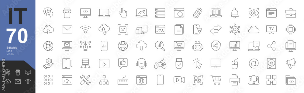 Information Technology Line Editable Icons set. Vector illustration in modern thin line style of Internet, Data processing, programming, web, technology, and multimedia icons. Isolated on white #624637305