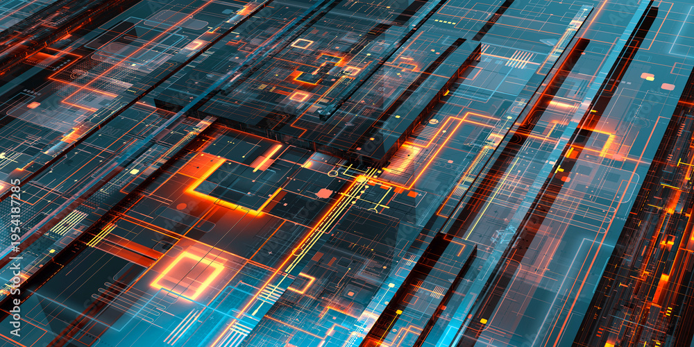 Integrated circuit architecture, abstract digital information multilayer network grid representing data flow, quantum computational systems, virtual infrastructure design. Microprocessor cores, 3D #1954187285