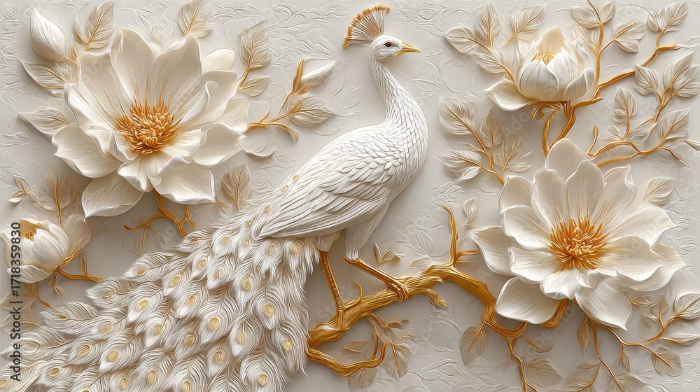 Intricate floral designs in gold and cream tones beautifully surround a white peacock in this stunning relief artwork #1718359830