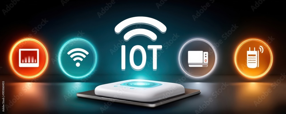 IoT devices on a wooden desk with laptops, speakers, and router illustrating connected technology #1951060455