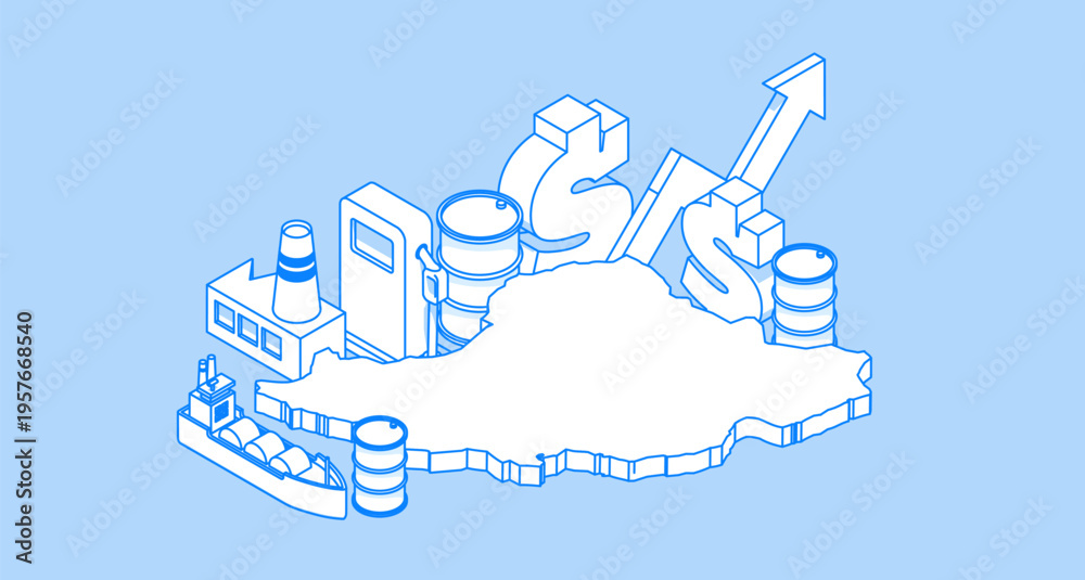 Iran oil industry map with isometric energy infrastructure icons illustrating petroleum production, tanker transport, refinery activity and global energy economyWeb #1957668540