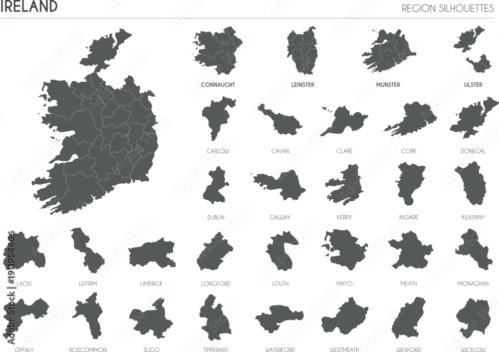 Ireland region silhouettes set and blank map of the country isolated on white background. Vector illustration design #1911954406