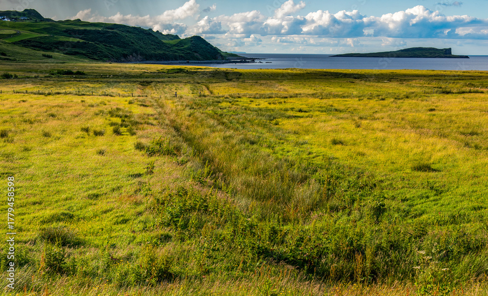 Isle of Skye, Scotland, Uk: aerial and panoramic view of the northeastern coast, with view of the small island Eilean Flodigarry in front of the township of Flodigarry, Trotternish Peninsula #1779458598