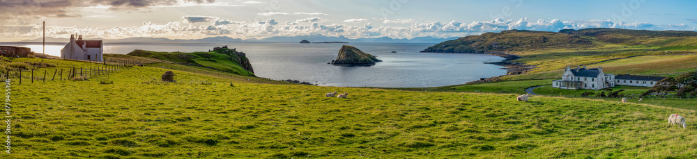 Isle of Skye, Scotland, Uk: view of the hamlet of Duntulm on the north coast of Trotternish, with Duntulm Castle ruins, seat in the 17th century of the chiefs of Clan MacDonald of Sleat #1779455198