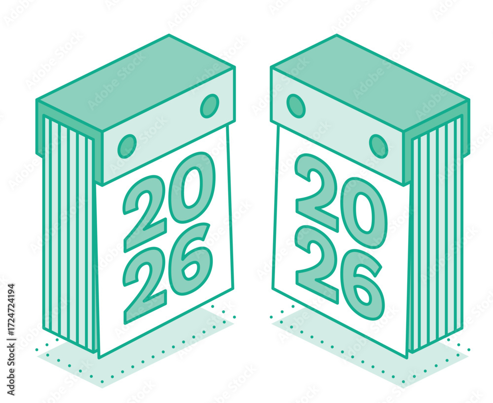 Isometric calendar icon. 2026. Isolated object. Tear off calendar. Outline style. #1724724194