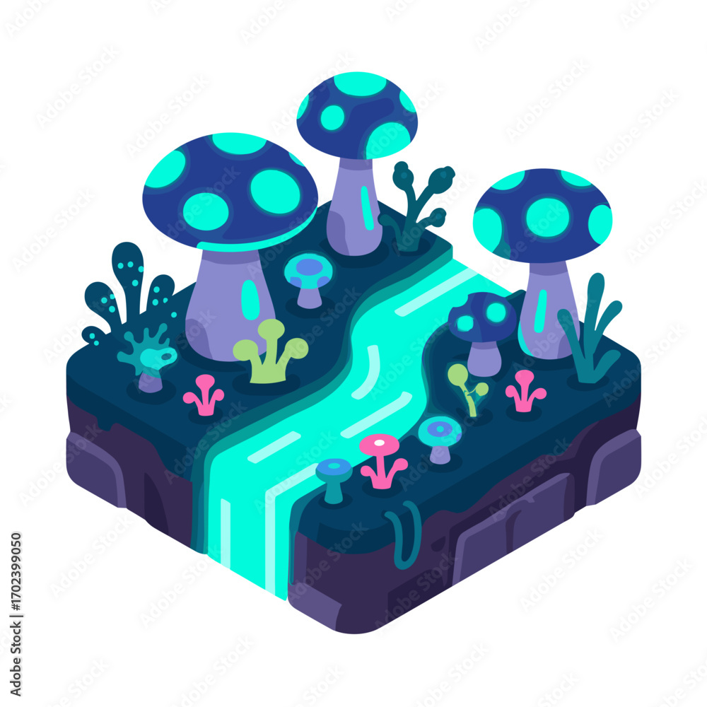 Isometric Glowing Mushroom Landscape Illustration with River and Plants, Fantasy Environment Design #1702399050