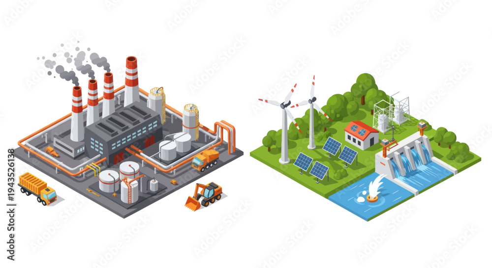 Isometric illustration of a polluting factory and a clean energy power plant. #1943526138