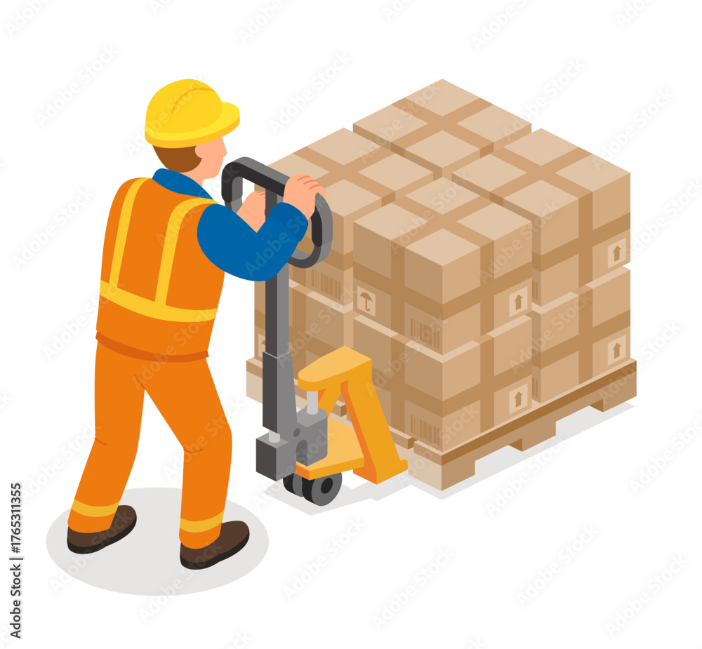 Isometric worker in orange uniform moving stacked boxes on a pallet truck. Logistics, warehouse, and cargo transport concept. #1765311355
