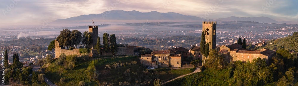 Italy, Idyllic traditional towns of romantic Tuscany. Picturesque borgo Buggiano hill top medieval village near Pienza. Panoramic drone view in morning light #1770957023