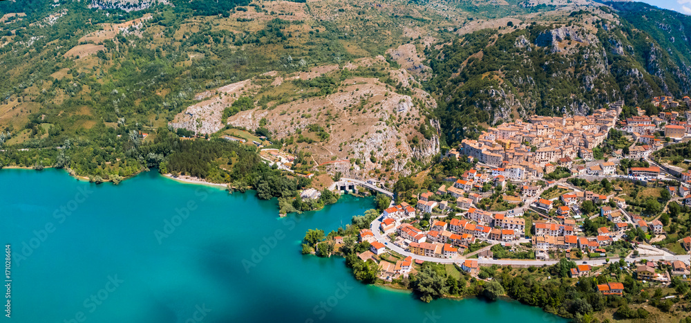 Italy tourism. Medieval scenic Barrea village and beautiful turquoise lake in Sangro Valley. National Park of Abruzzo and Molise. aeriald drone view. Italian scenery and postcard idyllic places #1710286614