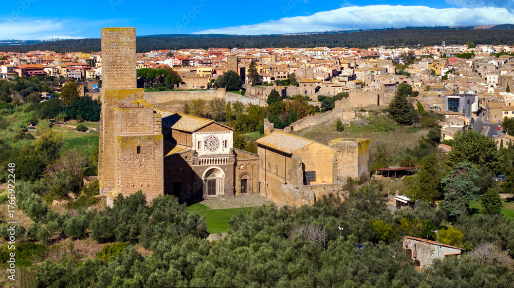 Italy, Viterbo province. Italian historic landmarks and archeological sites. ancient Etruscan city of Tuscania, Tuscia. view of San Pietro e Santa Maria Maggiore church. aerial drone view #1765972248