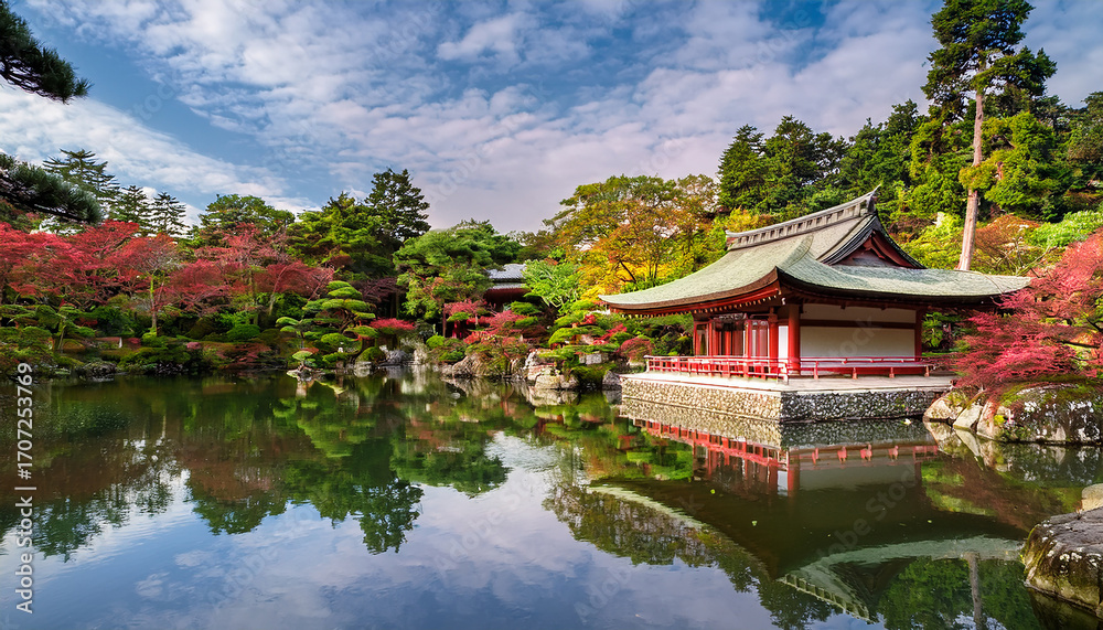 Japanese Temple and Autumn Trees Reflected in a Serene Garden Pond japanese garden reflection #1707253769