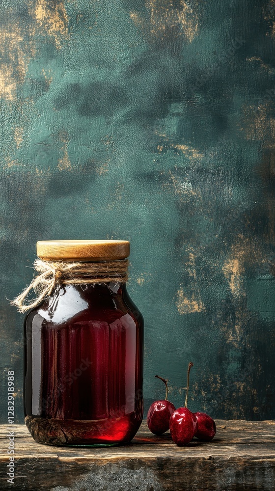 Jar of jam with a cherry on a rustic wooden table, capturing the essence of homemade goodness and culinary delight #1282918988