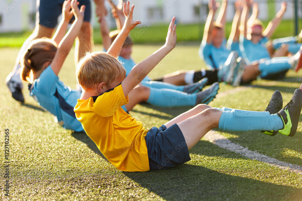 Kids Doing Outdoor Fitness Exercises on Football Field – Youth Sports Training, Team Warm-Up, Active Lifestyle for Children #1727102365