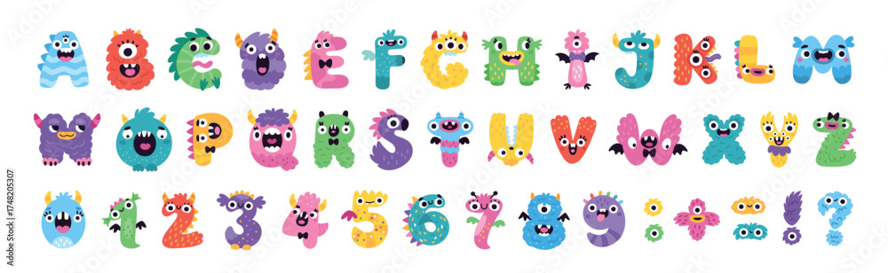 Kids monster font. Funny english alphabet, cute bright letters and numbers, fluffy ugly creations, childish cute abc, cartoon creative animals, nursery decoration garish vector isolated set #1748205307