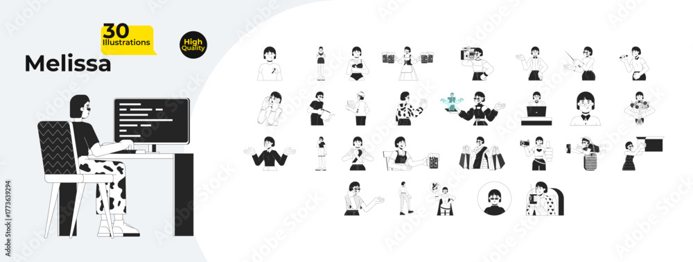 Korean female character with professional, social activities outline illustrations mega bundle. 90s, technology using, hobbies 2D linear images isolated. Collection black and white vector drawings #1773639294