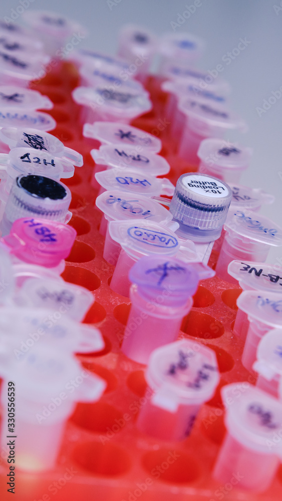 Laboratory rack with plastic tubes for DNA study. DNA gel-loading. Concept of science, laboratory and study of diseases. #330556539