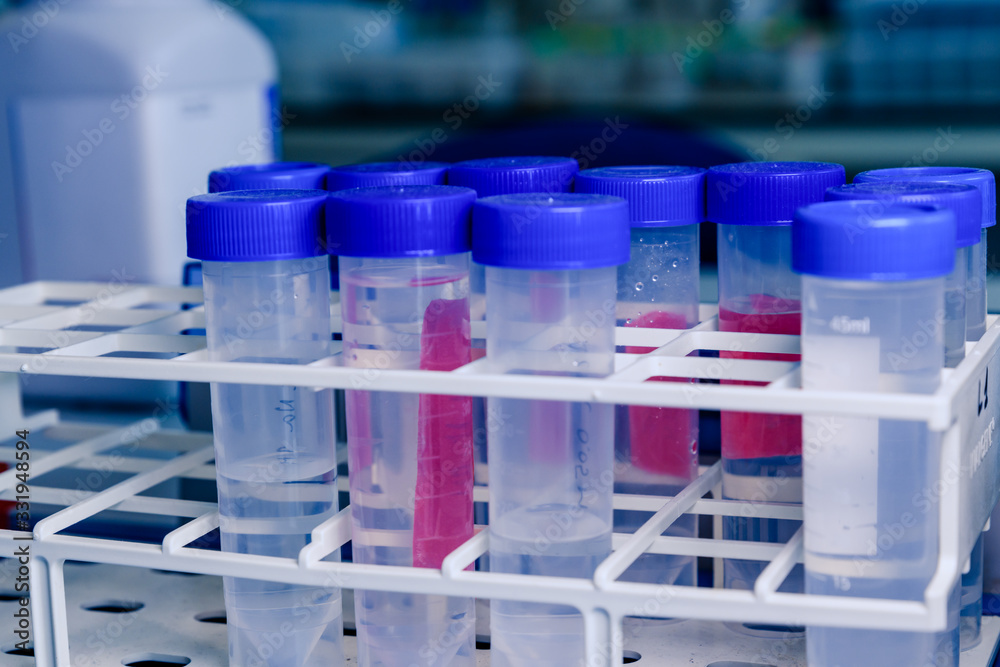 Laboratory test tubes in rack. Concept of science, laboratory and study of diseases. Coronavirus (COVID-19) treatment developing. #331948594