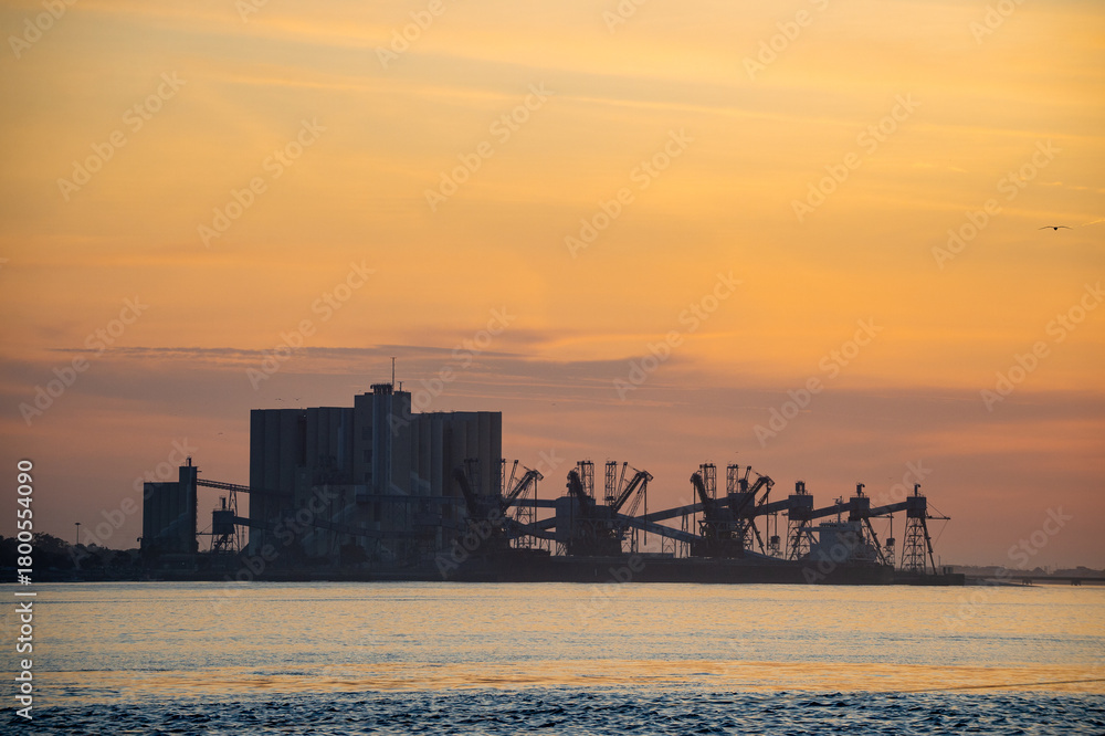 Large cereal grain silo port at Trafaria silhouetted against the setting sun as view from Belem, Lisbon. #1800554090