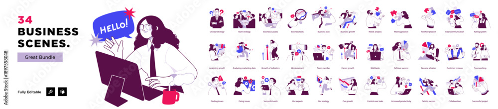 Large flat illustration bundle showing multiple business scenes including communication, strategy, teamwork, analytics, growth, and customer interaction concepts. #1897558048