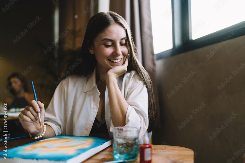 Laughing female artist gazes at her artwork, hand under chin—moment of digital delight blending creativity, personality and authentic joy through personal art exploration. #1754394980