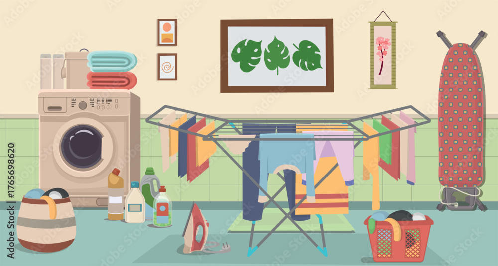 Laundry room with dirty clothes, washing machine, and shelves with powder and drying rack with clothes. Clothes are drying on lines. Clean clothes.. Vector illustration #1765698620