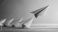 Leading yellow paper plane flying ahead of a row of white and orange planes on a wooden surface, depicting market leadership, competitive edge, and moving forward in business. #1946569385