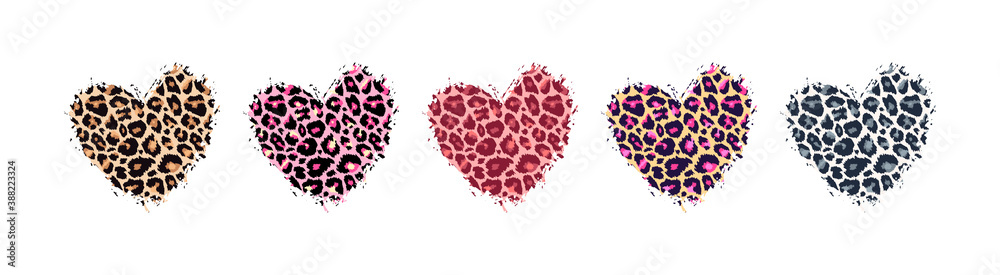 Leopard print textured hand drawn brush stroke heart shape set . Abstract paint spot with wild animal cheetah skin pattern texture. Brown, yellow, pink, grey vector design elements for print designs #388223324