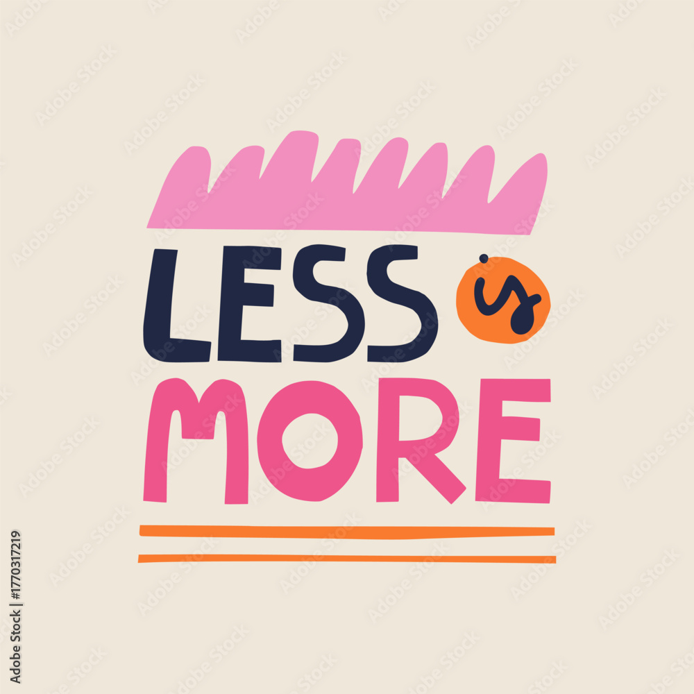 Less Is More paper cutout lettering. Cute motivational affirmation phrase in handcrafted collage style. Whimsical positive kind reminder for postcards, stickers or t-shirt print. #1770317219