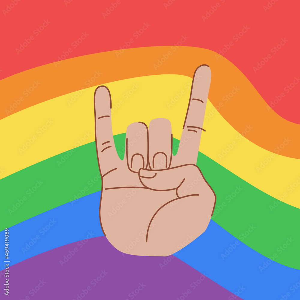LGBT poster design. LGBT concept. Hand gesture of rock. Rock sign on background of LGBT flag. #459419089