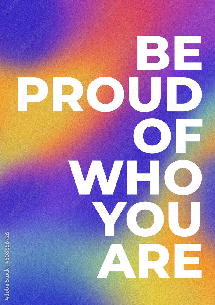 LGBTQ+ poster on gradient texture background. Textured background in lgbt colours. "Be proud of who you are" quote. #508656726